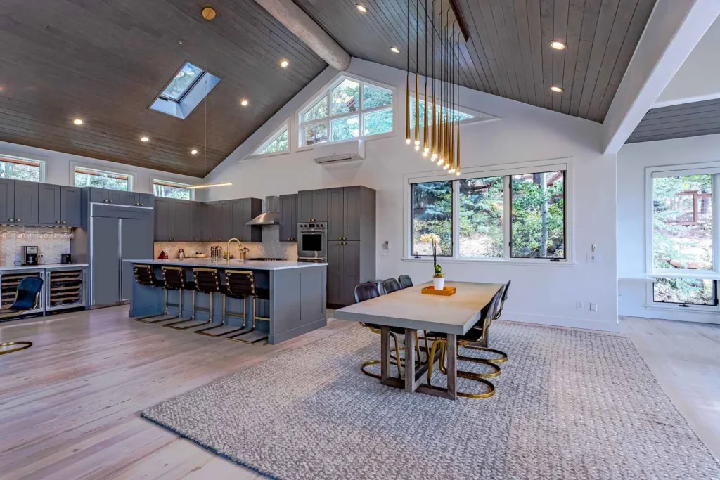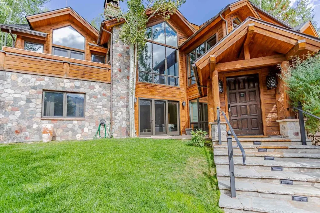Located a fifteen-minute walk from the center of Aspen, this picture-perfect getaway is a luxuriously modern take on the classic log cabin. At the heart of the home, a grand living space with enormous windows and vaulted ceilings is finished in a sophisticated grey and white palette. The exposed stone fireplace and comfy L-shaped sofa make for an ideal spot to keep toasty after long hikes. When the weather’s warm spill out onto the deck and lap up the mountain views. Gather around the rattan dining set for meals alfresco or take a minute to yourself with a paperback and a glass of your favorite wine. When dusk falls, roast marshmallows over the patio’s fire pit, get toasty in the barrel sauna (perfect for 2 people), or come together for movie night in the cozy family room. After a peaceful sleep, wake up to the sunrise and lace up your walking boots. You’ve direct access to Smuggler Mountain and Hunter Creek Valley from the top of your street.